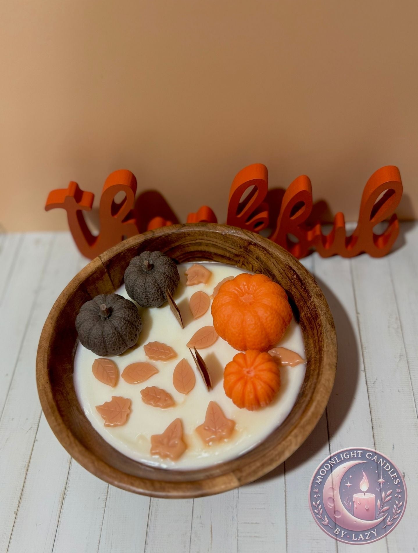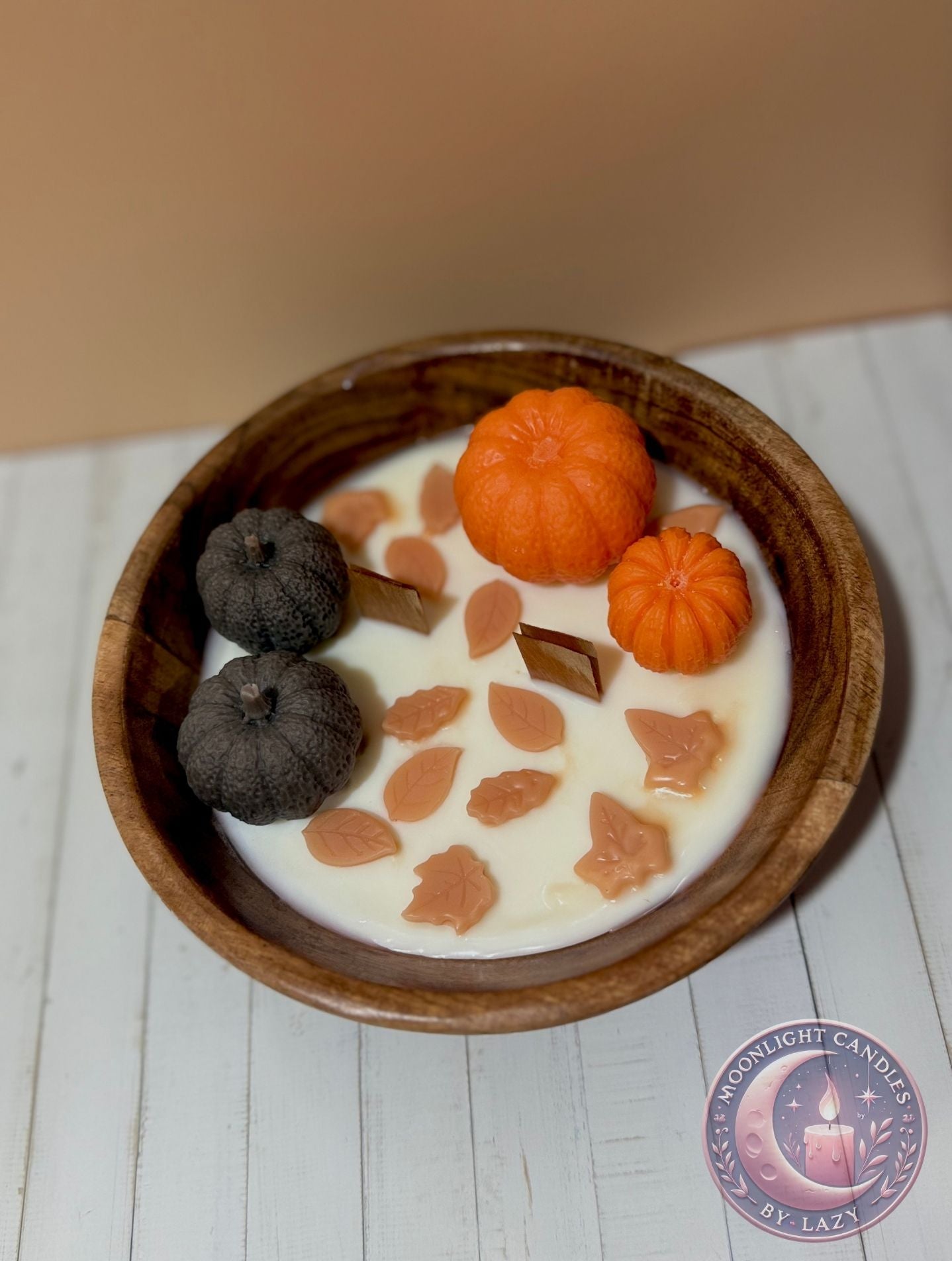 Una espectacular vela en cuenco de madera, decorada con mini calabazas de cera en tonos naranja y negro, y pequeñas hojas otoñales que flotan sobre la superficie. Con mechas de madera que al encenderse crean un suave crepitar, esta pieza es perfecta como centro de mesa para darle un toque cálido, rústico y elegante a tu hogar en esta temporada. 🍁✨