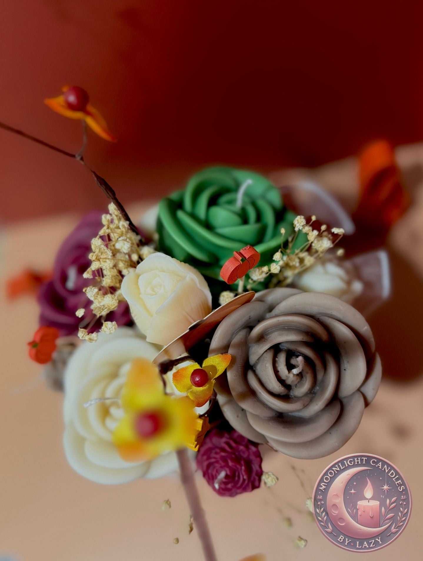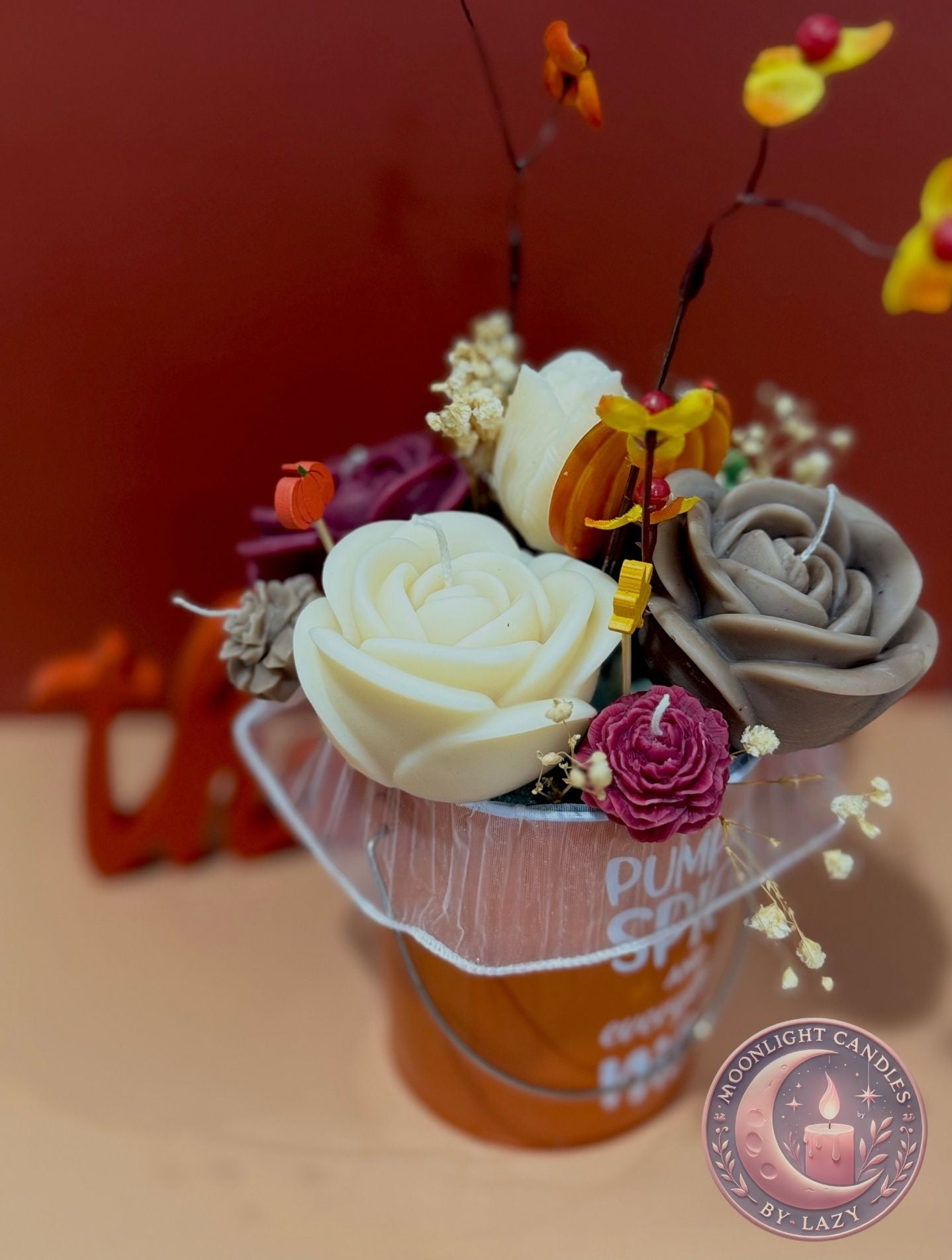 Un elegante arreglo de velas en forma de rosas, en tonos neutros y tierra, acompañado de detalles secos y toques de color que evocan la calidez de la temporada. Colocado en un recipiente color terracota con tul decorativo, es ideal para quienes buscan un centro de mesa sofisticado y acogedor para el otoño. 🍁✨