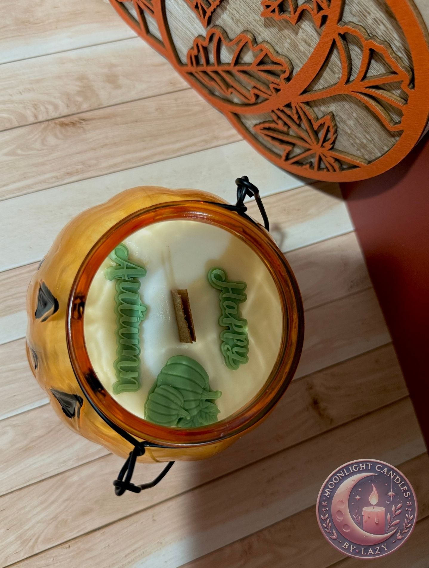 Vela artesanal en frasco de vidrio con forma de calabaza tallada, perfecta para la temporada de otoño y Halloween. Decorada con cera en tonos verdes que forman la frase “Happy Autumn” y una pequeña calabaza, es ideal para ambientar tu hogar con un toque festivo y acogedor. Su mecha de madera añade un crepitar relajante que completa la experiencia sensorial. 🍂✨