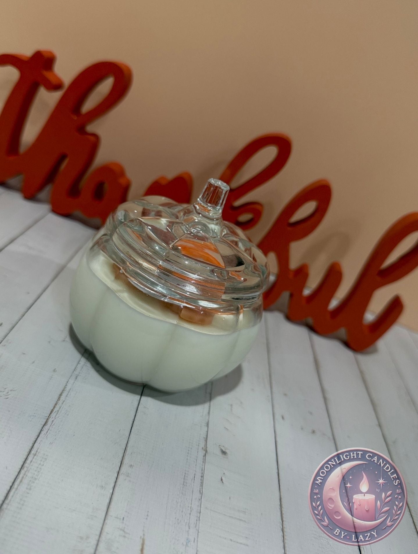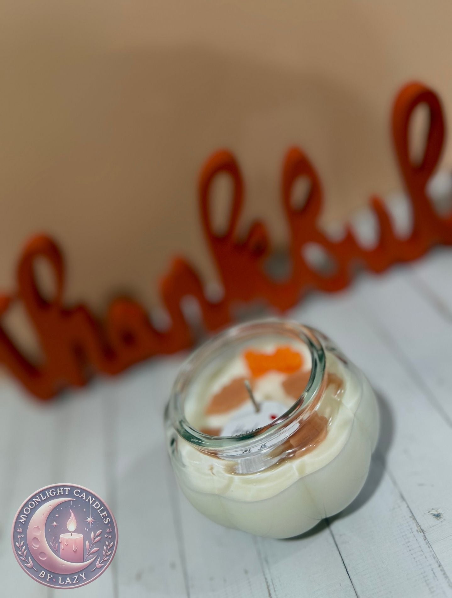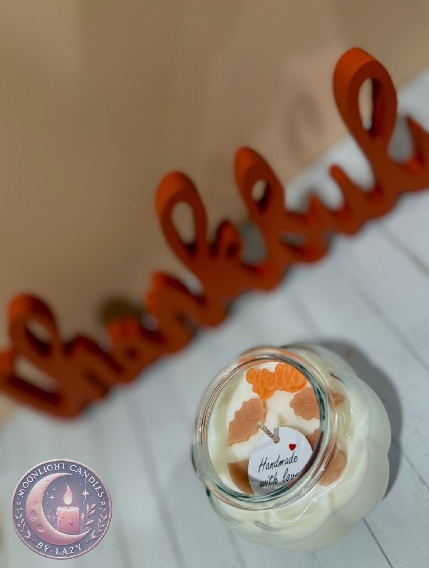Una delicada vela en frasco de vidrio con forma de calabaza, rellena de cera blanca y decorada con hojas otoñales de cera y la palabra “Hello” en color naranja. Su diseño es sencillo pero encantador, ideal para dar la bienvenida a la temporada y llenar tu espacio de calidez y estilo. ✨🍂