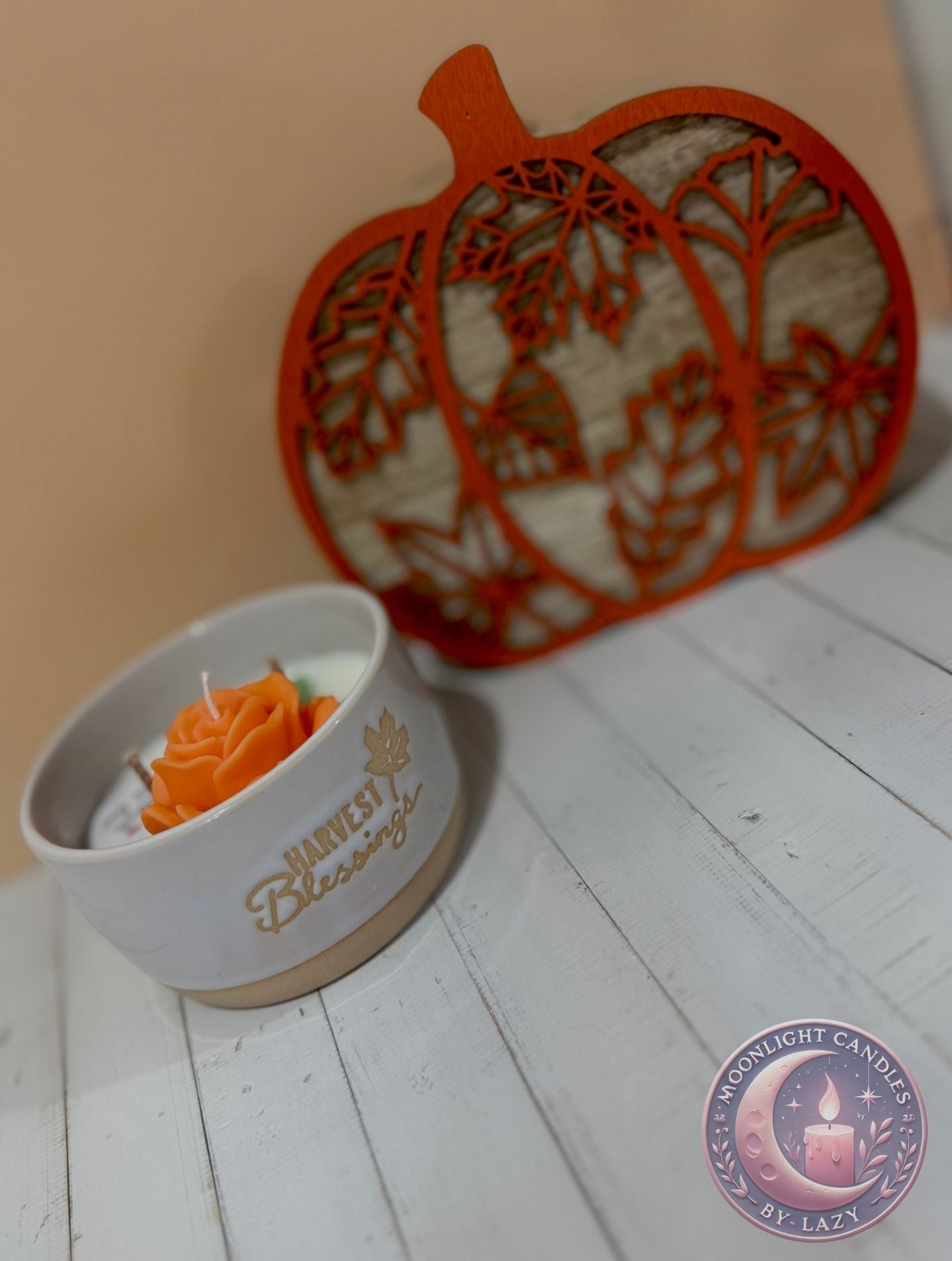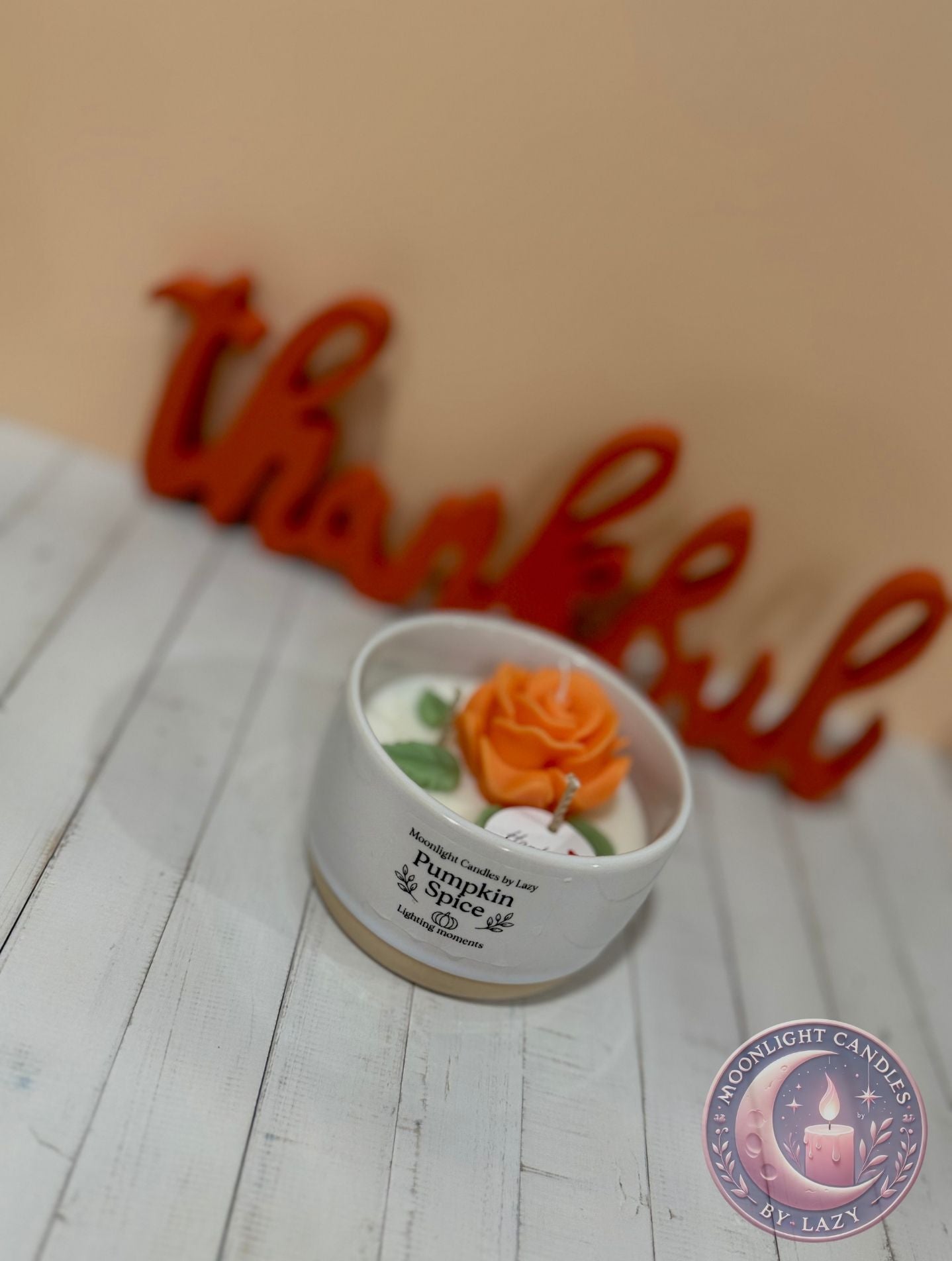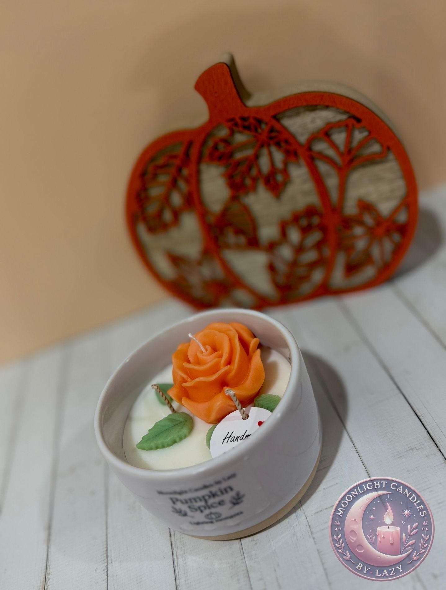 Una vela artesanal perfecta para el otoño, con un delicado diseño de rosa en tono naranja que añade un toque elegante a tu espacio. Su aroma a pumpkin spice combina notas cálidas de canela, nuez moscada y clavo, creando una atmósfera acogedora y festiva. Ideal para llenar tu hogar de confort y gratitud en esta temporada.
