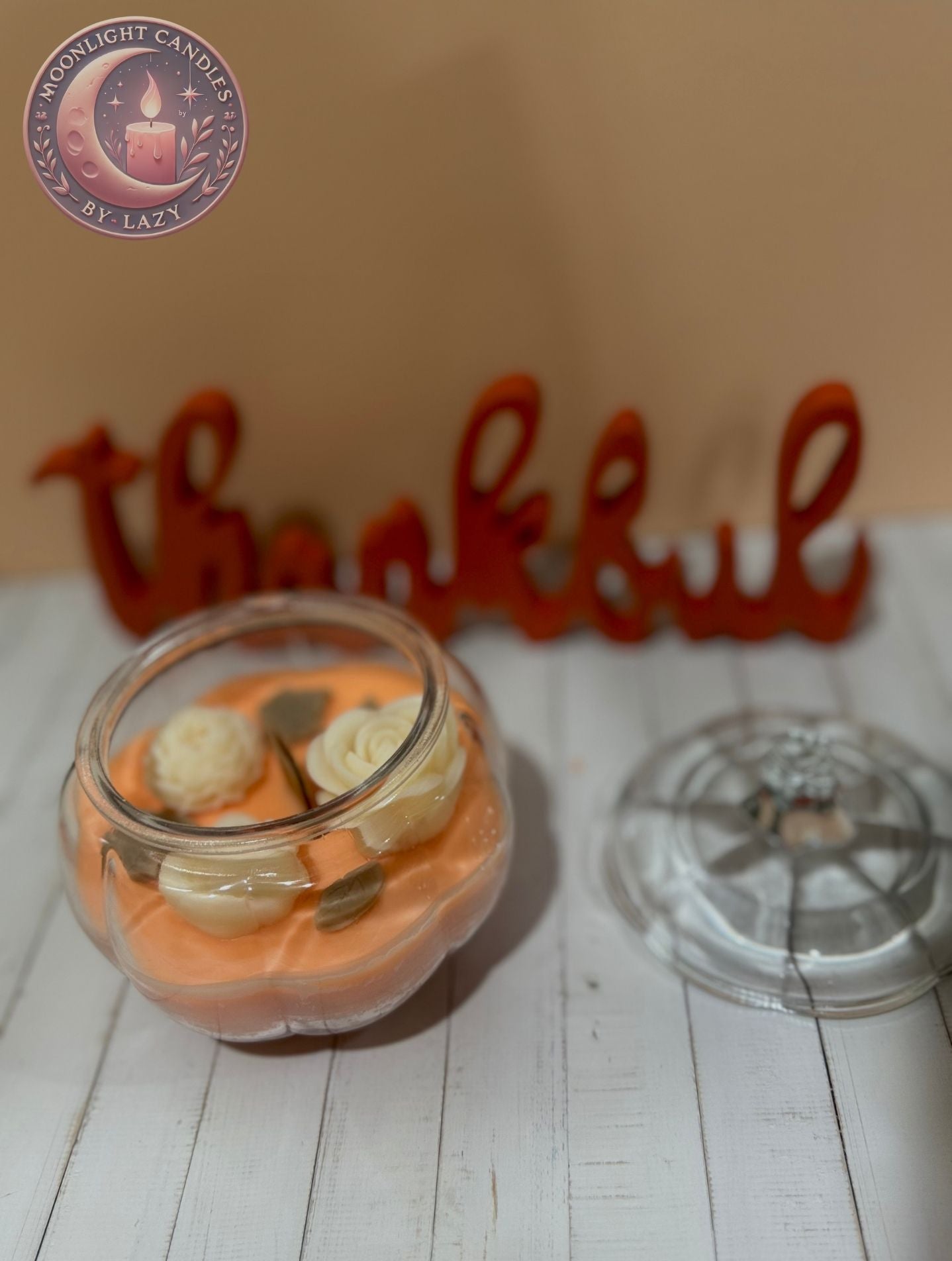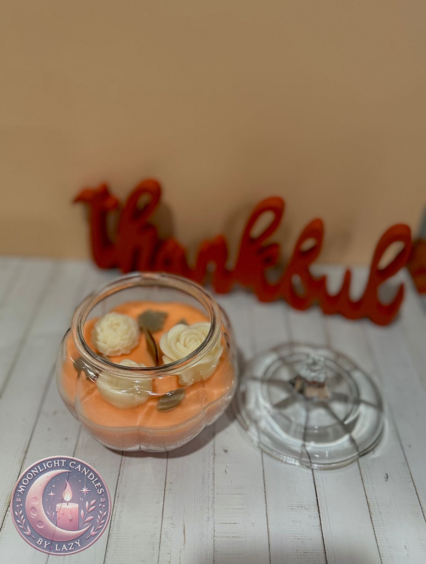Una elegante vela en frasco de vidrio con forma de calabaza, rellena de cera color naranja y decorada con delicadas flores de cera en tono marfil y pequeñas hojas verdes. Su diseño artesanal aporta un toque romántico y acogedor, ideal para ambientar cualquier espacio en la temporada de otoño. 🍂