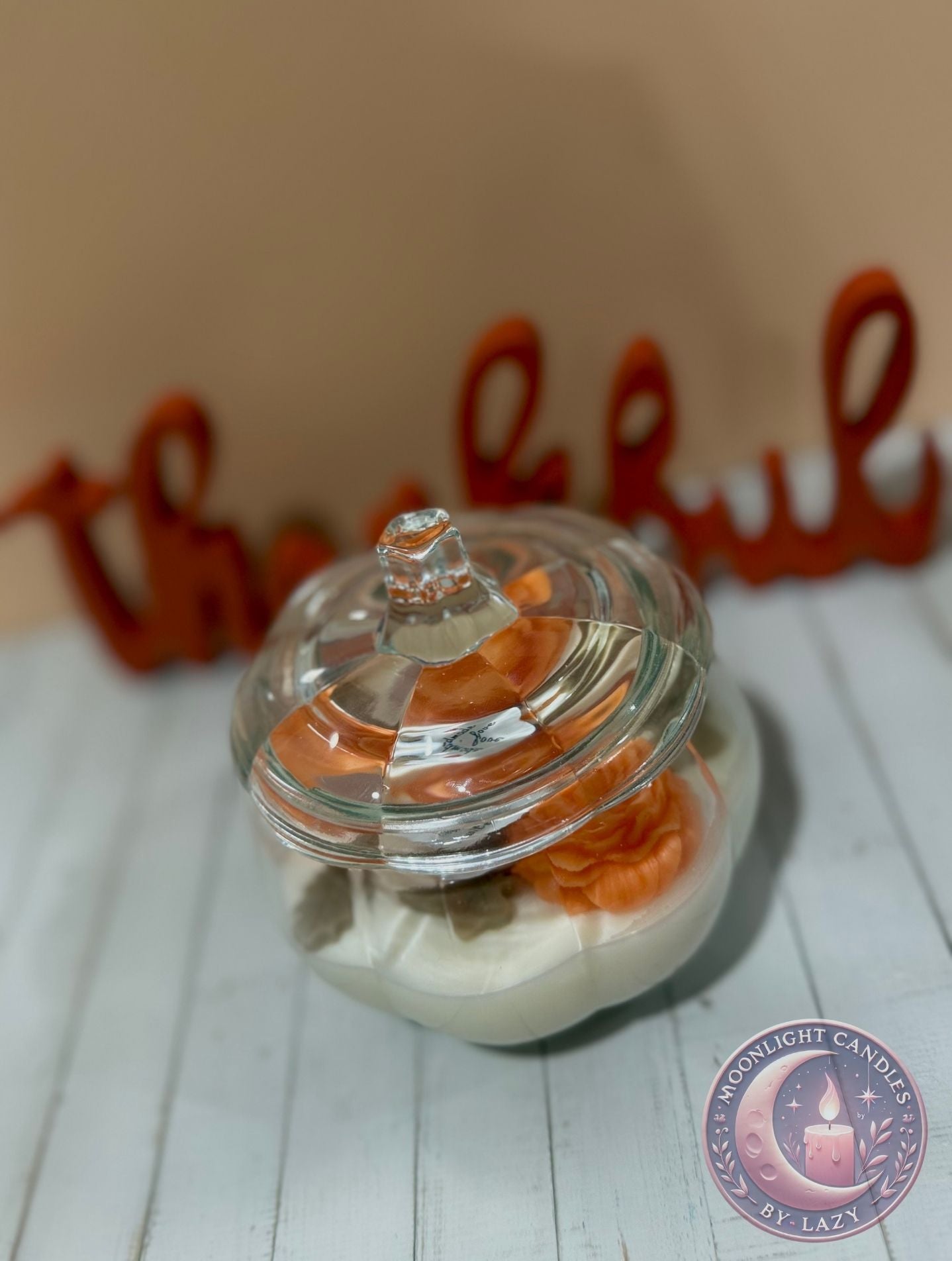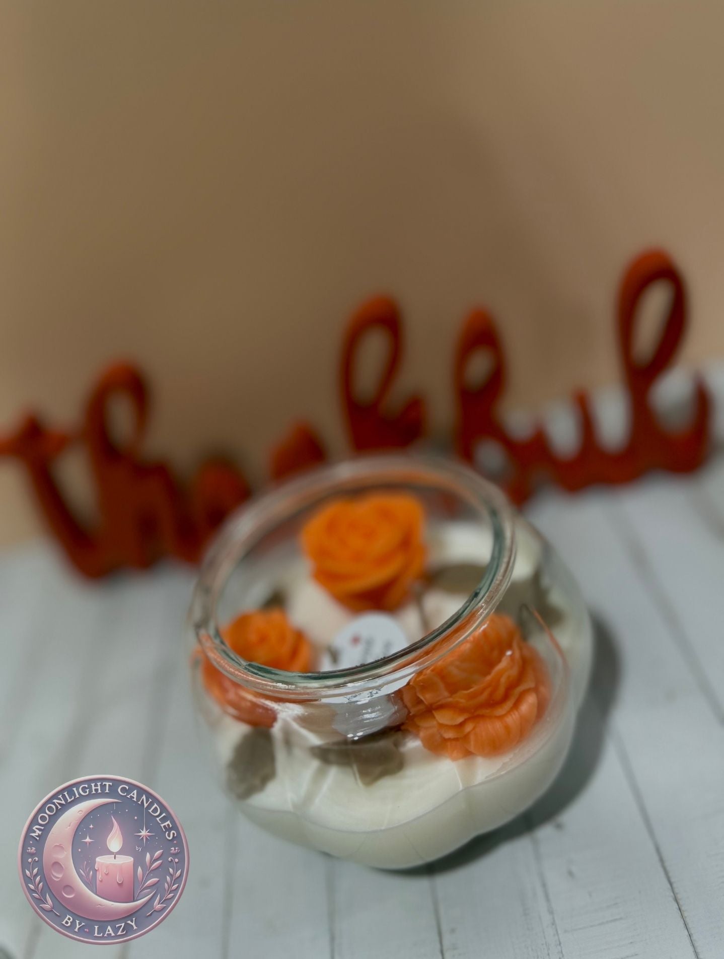 Una elegante vela en frasco de vidrio con forma de calabaza, rellena de cera blanca y decorada con delicadas rosas de cera en tonos naranjas y hojas marrones. Su diseño romántico y otoñal es perfecto para decorar tu hogar y llenar el ambiente de calidez y estilo en esta temporada. Ideal para regalar o complementar cualquier rincón especial. 🍂